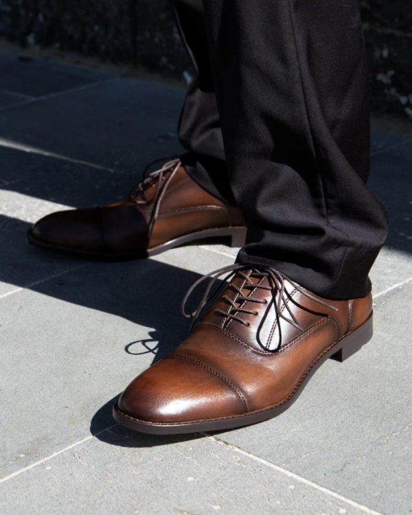 These Oxford style brown leather shoes features a refined toecap design, almond toe shape and a five-eyelet facing, embodying a timeless and classic style. . Handcrafted with meticulous care, the resin rubber sole boasts an extended welt for both durability and style.