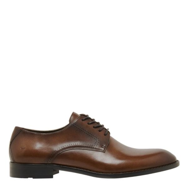 These brown derby style shoes features a classic design with a plain upper and a five-eyelet facing for timeless appeal. The almond toe adds sophistication, making it suitable for various formal occasions.