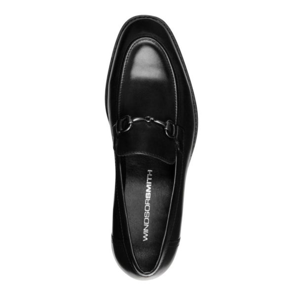 Emil black leather loafers offer a sleek design with a hand-finished upper. These slip-on dress loafers feature an almond toe shape and horse-bit hardware, combining style and ease.