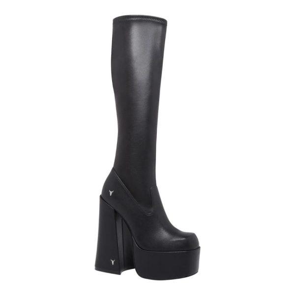 Unleash your bold side with these knee-high platform sock boots. Featuring platform high heels and chunky heels, these black platform boots embody the iconic Windsorsmith style.